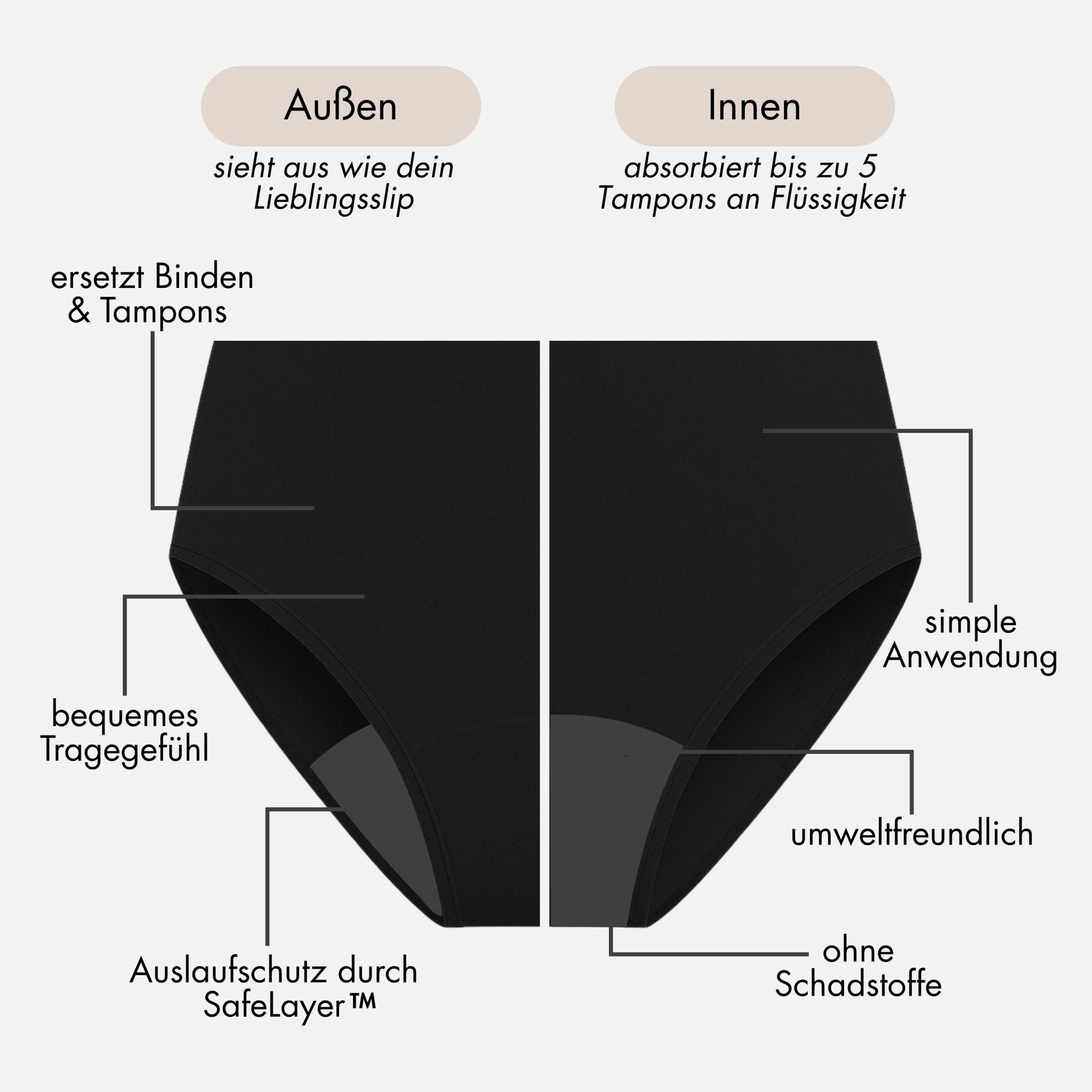 Unsere Periodenunterwäsche wurde für den unkomplizierten Einsatz während der Menstruation entwickelt. Durch die spezielle 4-Lage-Technologie, benötigst du keine Periodeneinwegprodukte wie zum Beispiel Tampons, Einwegbinden oder Slipeinlagen mehr. Das Blut wird superschnell absorbiert und bietet dadurch einen umfassenden Auslaufschutz ohne Nässegefühl.
