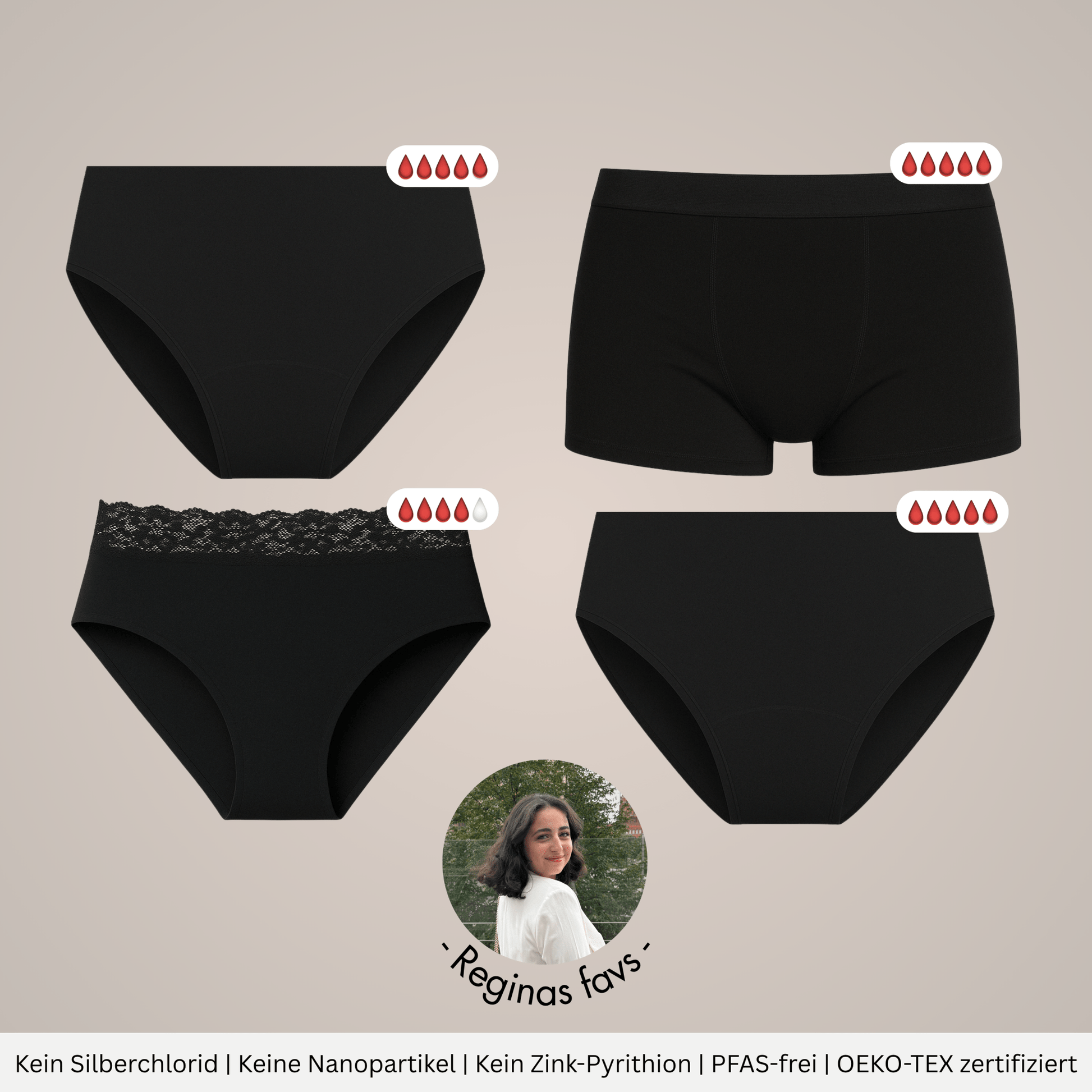 Unsere Periodenunterwäsche wurde für den unkomplizierten Einsatz während der Menstruation entwickelt. Durch die spezielle 4-Lage-Technologie, benötigst du keine Periodeneinwegprodukte wie zum Beispiel Tampons, Einwegbinden oder Slipeinlagen mehr. Das Blut wird superschnell absorbiert und bietet dadurch einen umfassenden Auslaufschutz ohne Nässegefühl.