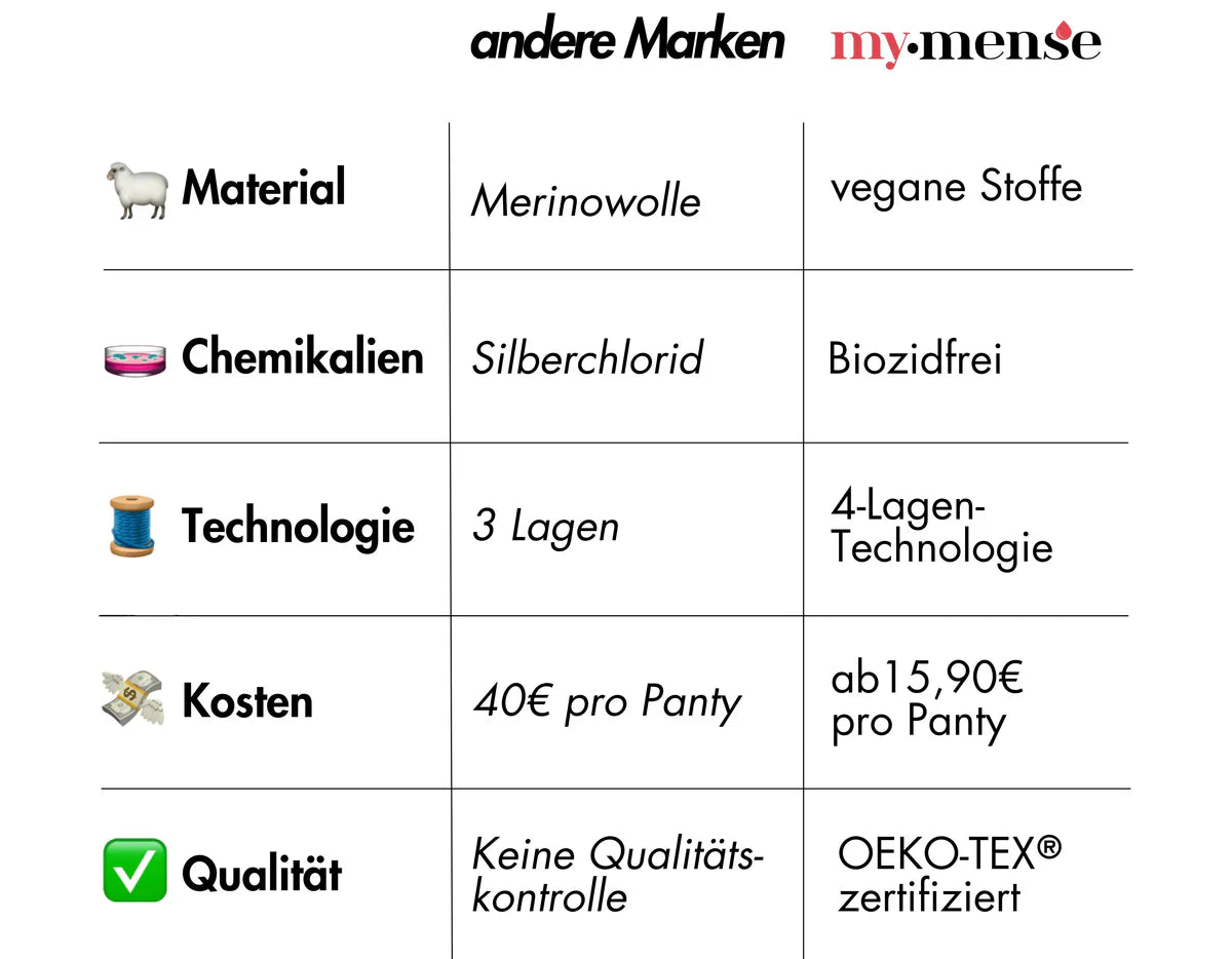 Ja! Bei my•mense erhältst du nicht nur hochwertige Periodenunterwäsche für eine starke Blutung, sondern auch umfassenden Support. Schon vor deinem Kauf beraten wir dich gerne und helfen dir dabei, die passende Periodenslip-Größe zu finden – mit praktischen Tipps und Hinweisen direkt in unserem Shop. Ab einem Bestellwert von 45 € versenden wir deine Produkte sogar versandkostenfrei. Auch nach dem Kauf steht dir unser Team jederzeit mit Rat und Tat zur Seite. Damit du deine Bestellung ganz entspannt abschließen kannst, bieten wir dir außerdem alle gängigen Zahlungsmethoden an.