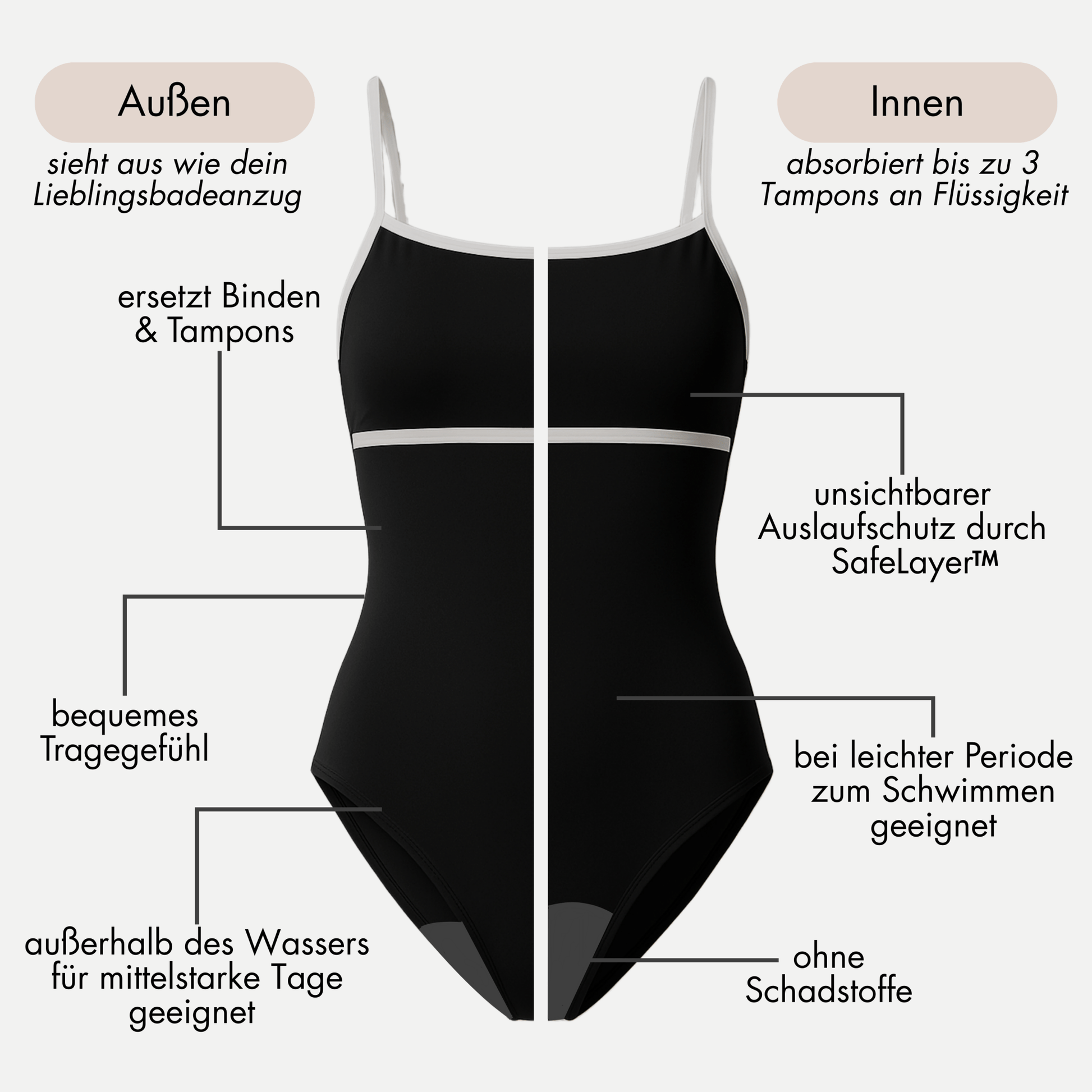 Dieser Periodenbadeanzug bietet zuverlässigen Schutz bei einer mittelstarken Periode, fühlt sich dabei aber wie dein normaler Lieblingsbadeanzug an. Die Absorptionsstärke entspricht der Saugkraft von 3 Tampons. Bei einer leichten Periode kannst du damit auch problemlos schwimmen gehen.