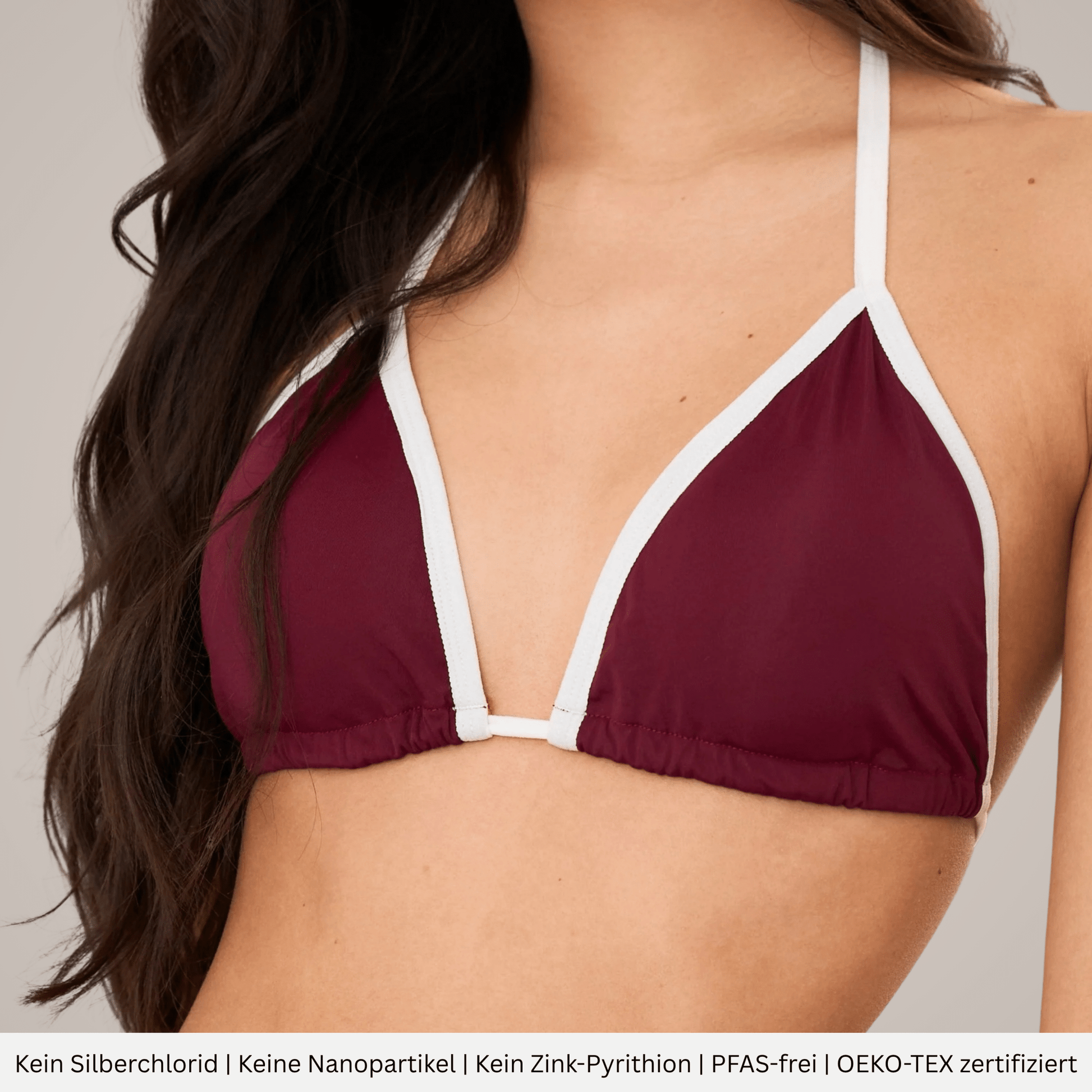 Dieses Bikini Top ist die perfekte Ergänzung zum burgund Periodenbikini Bottom. Es bietet dir optimalen Halt und ein angenehmes Tragegefühl. Die herausnehmbaren Cups passen sich deinem Komfort an.